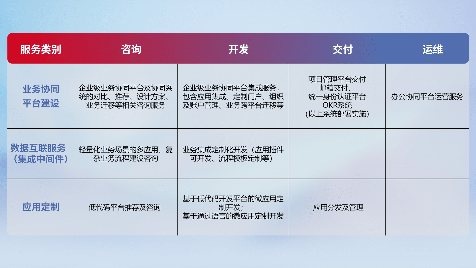 针对钉钉、、、、企微、、、IDaas等平台级产品提供产品的规划、、、方案、、交付、、、、定制化开发等服务,,,实现如统一协同办公、、智能客户服务、、、、混合会议管理、、智能数据查询、、、等业务场景,,,,实现数字化转型。。。。