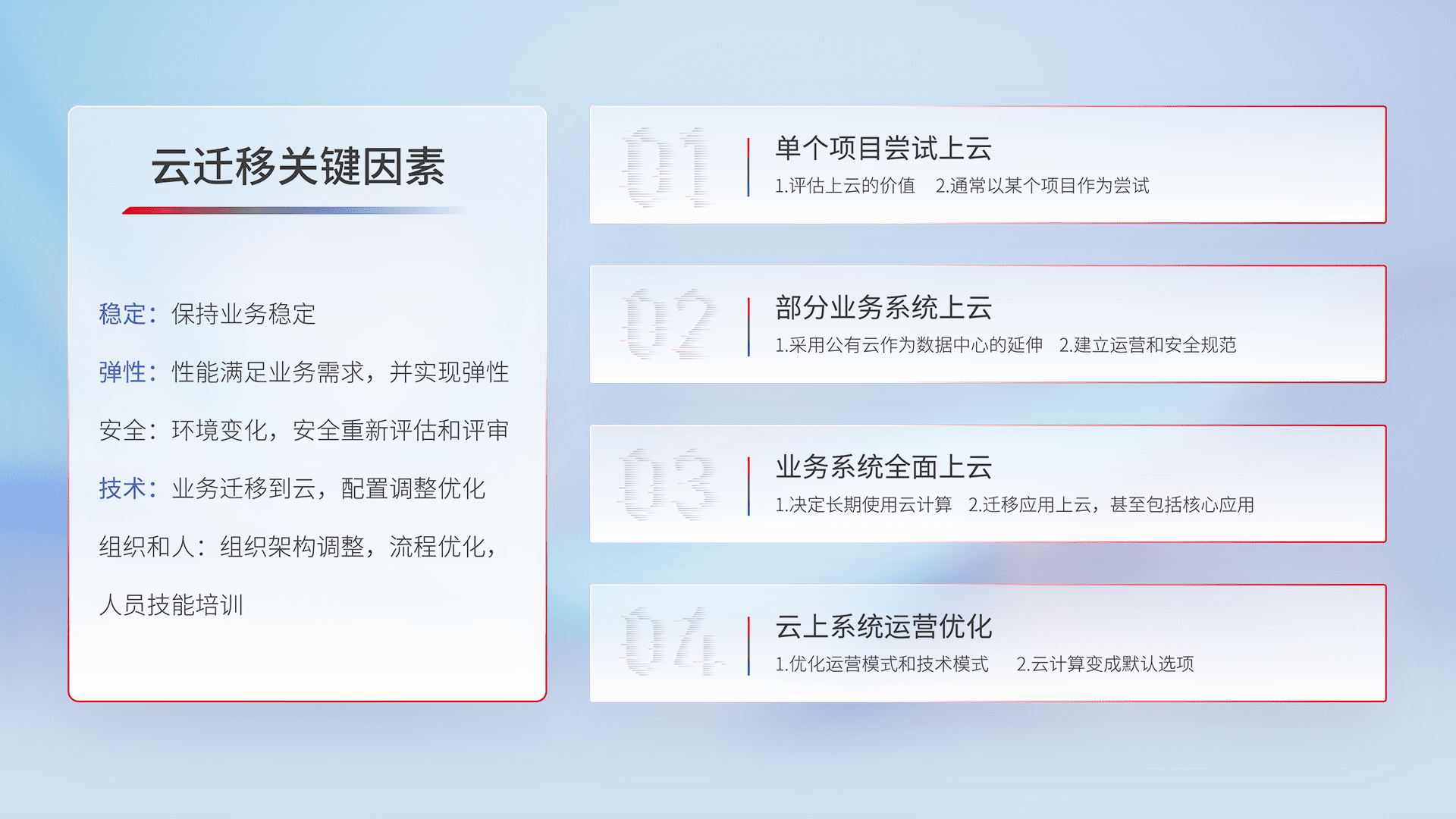 结合实际业务,,,从规划设计、、、、云平台选型、、云原生改造、、、数据迁移、、、、集成交付,,迁移全过程为客户识别最佳上云路径,,做好风险识别管理,,设计网络架构、、身份权限、、、、安全审计合规、、、操作审计、、、日志审计、、、监控告警策略、、、多站点容灾设计等,,对云上基础设施进行整体规划,,,提升IT治理水平,,以满足弹性、、、高可用、、、高性能的需求。。。