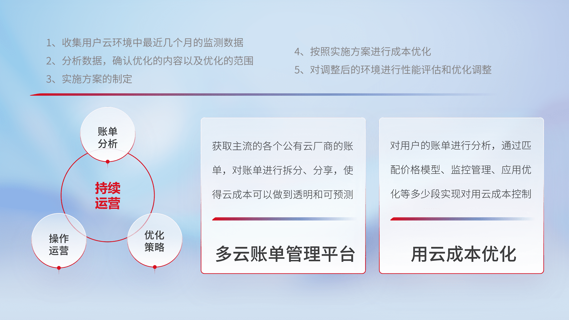 通过多云纳管,,,以统一的资源数据模型把客户的云资源进行抽象和封装,,进而实现对多云资源的统一操作,,,,保障云资源管理的可靠性、、、稳定性与可用性。。。。量身定制化运维内容,,配置、、开发运维、、、补丁管理、、备份、、监控、、、认证和访问管理、、、、审计和日常巡检等,,,保障在用云过程中的可靠度,,,稳定度以及高可用率。。。