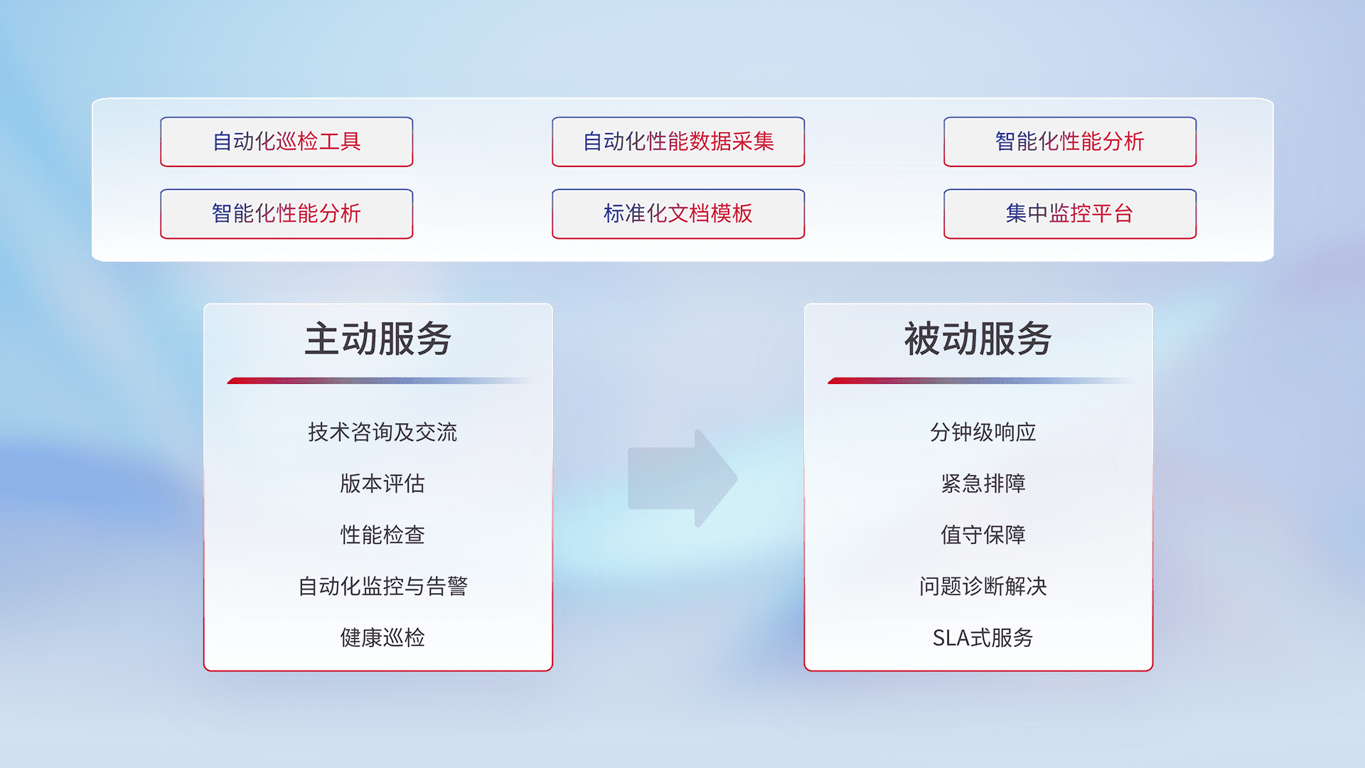 智能化工具和标准化文档,,,保障服务质量,,,提供主动服务(包含技术咨询、、、版本评估、、性能检查、、、、自动化监控与告警、、健康巡检)和被动服务包含(分钟级响应、、紧急排障、、、、值守保障、、问题诊断解决、、SLA服务)。。